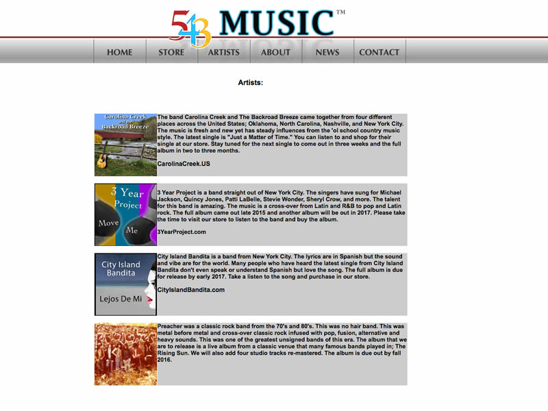 This is the producer and distributor of all music coming out of 543 Media, Inc (including the bands Carolina Creek and the Backroad Breeze, City Island Bandita, 3 Year Project, and more.